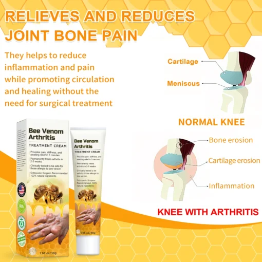 When applied to the skin, bee venom can interact with receptors involved in pain perception and inflammation. This interaction can lead to modulation of inflammatory pathways, potentially reducing the release of pro-inflammatory molecules that contribute to swelling of joints and bones.