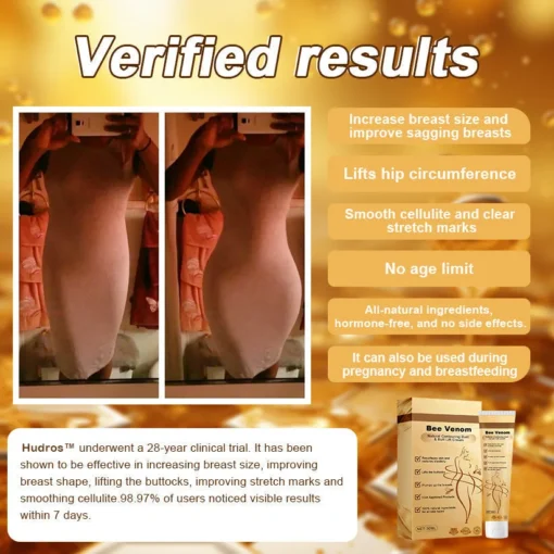 The bee venom in ๐๐ฎ๐๐ซ๐จ๐ฌโข is scientifically blended to perfection with other ingredients. It stimulates blood circulation to the breasts and other parts of the body, and achieves breast enlargement and buttock lift by promoting the boosting of cell volume in a way that is uncomfortable and safe!
