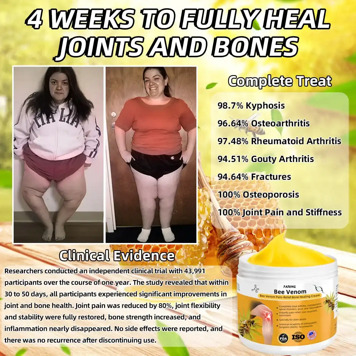 ๐ญ๐จ๐ป๐ถ๐ต๐ฎยฎ Bee Venom Pain-Relief Bone Healing Cream est reconnu pour son efficacitรฉ dans le traitement d’une large gamme de problรจmes orthopรฉdiques. Ce traitement englobe l’arthrose, la polyarthrite rhumatoรฏde, la bursite, la tendinite, l’ostรฉoporose, la goutte, le syndrome du canal carpien, les entorses et les foulures ligamentaires, les dรฉformations des oignons et le tennis elbow.