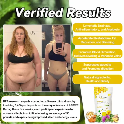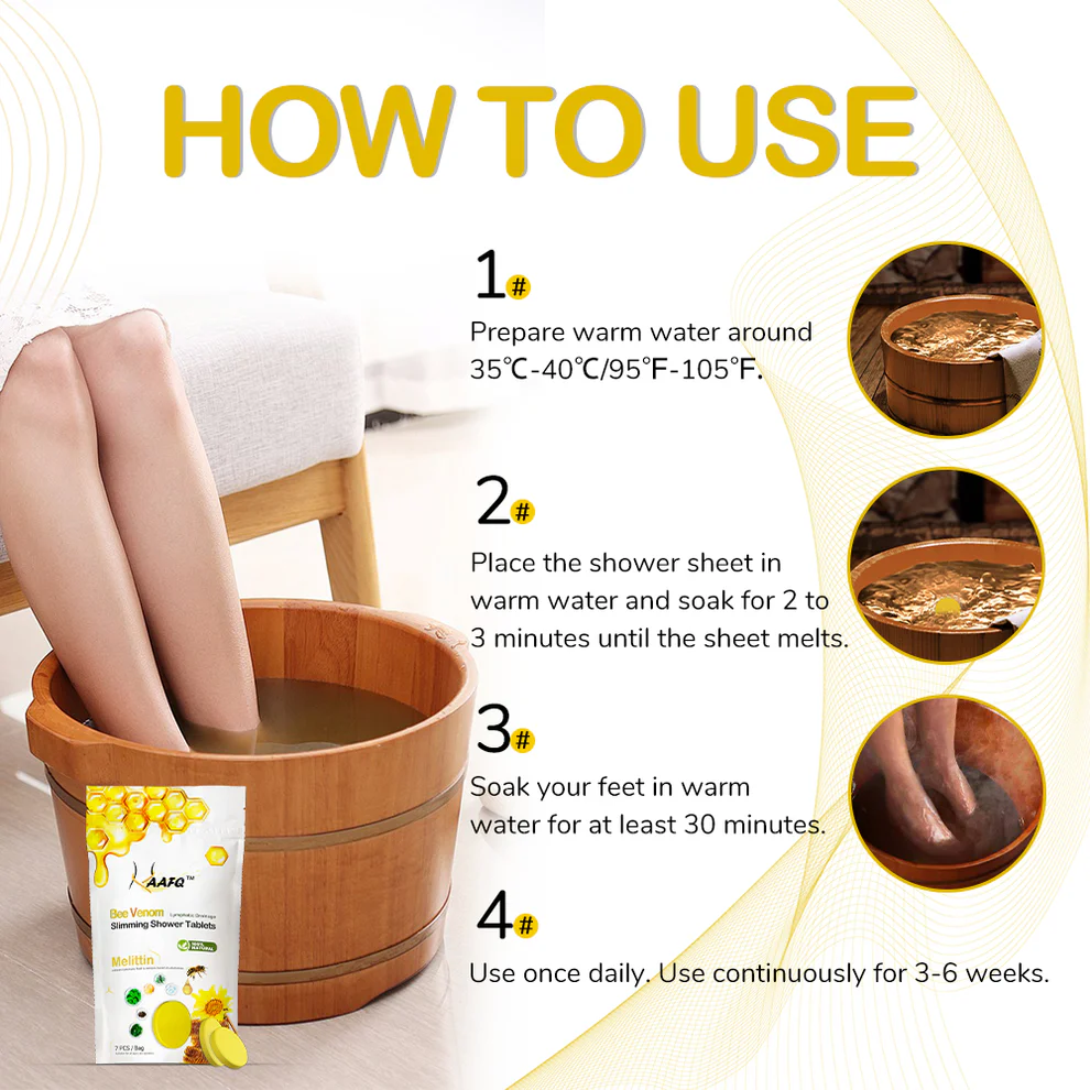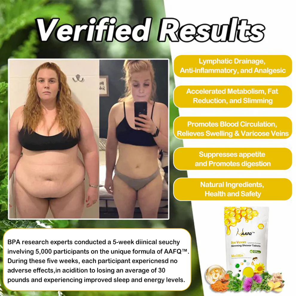 The digestive and lymphatic systems are crucial detox pathways in the body. That’s why we developed the AAFQβ’ Bee Venom Lymphatic Drainage Slimming Shower Tablets, containing bee venom and extracts of iceplant, along with four herbal extracts. These highly active ingredients are concentrated and encapsulated within the film of the slimming patch. During application, the close contact between the abdominal area and the silk film made of natural herbs stimulates intestinal peristalsis, allowing for faster and more effective penetration into the lymphatic system. By cleansing the lymph nodes to rid waste, aiding liver detoxification, and absorbing toxins, it improves metabolism, facilitating effortless fat loss, reducing inflammation, and promoting overall bodily health.