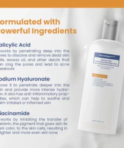 Exfoliates Dry, Dark Skin Layer: AcneXpert+™ effectively tackles the buildup of dead skin cells that can lead to an uneven and dull skin tone. Through gentle exfoliation, this cleansing lotion helps eliminate the accumulation of dead cells, promoting a smoother and more radiant complexion. Additionally, exfoliation aids in lightening dark areas by breaking down the adhesive bonds between dead skin cells, making their removal effortless and gentle.