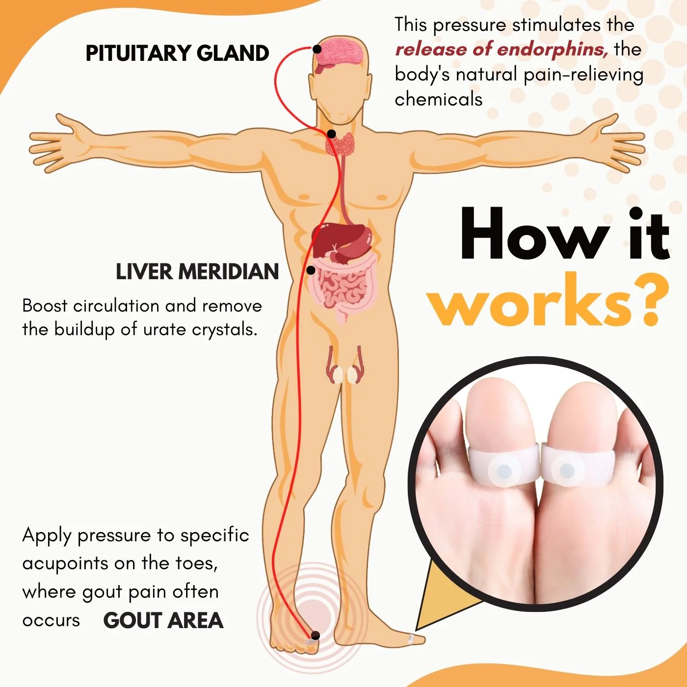 In the case of gout, the AcuHealth™ Gout Aid Toe Rings apply pressure to specific acupoints on the toes, where gout pain often occurs. This pressure stimulates the release of endorphins, the body’s natural pain-relieving chemicals. It also increases blood flow to the affected area, which helps to reduce inflammation and swelling.