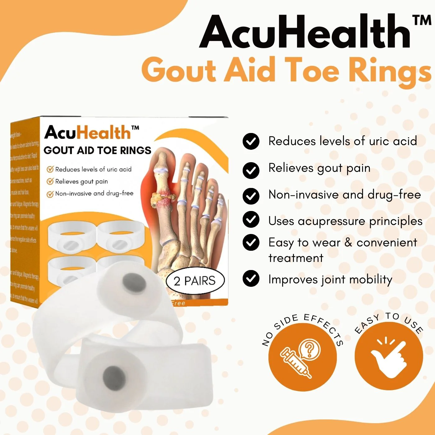 The combination of acupressure and improved circulation makes AcuHealth™ Gout Aid Toe Rings a safe and effective solution for those who suffer from gout. The rings provide natural pain relief without the use of drugs, making them a convenient and accessible option for those seeking a more holistic approach to managing their symptoms, says Dr. Ray Moyer, Gout Specialist, MD.