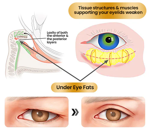Bags under eyes are caused when the tissue structures and muscles supporting your eyelids weaken. The skin may start to sag, and fat that’s usually around the eye can move into the area below your eyes. Also, the space below your eyes can gather fluid, making the area look puffy or swollen. EyeRevive™ Instant Firming Eye Cream is specially designed for target to reduce the appearance of dark circles and bags under eyes effectively and naturally.