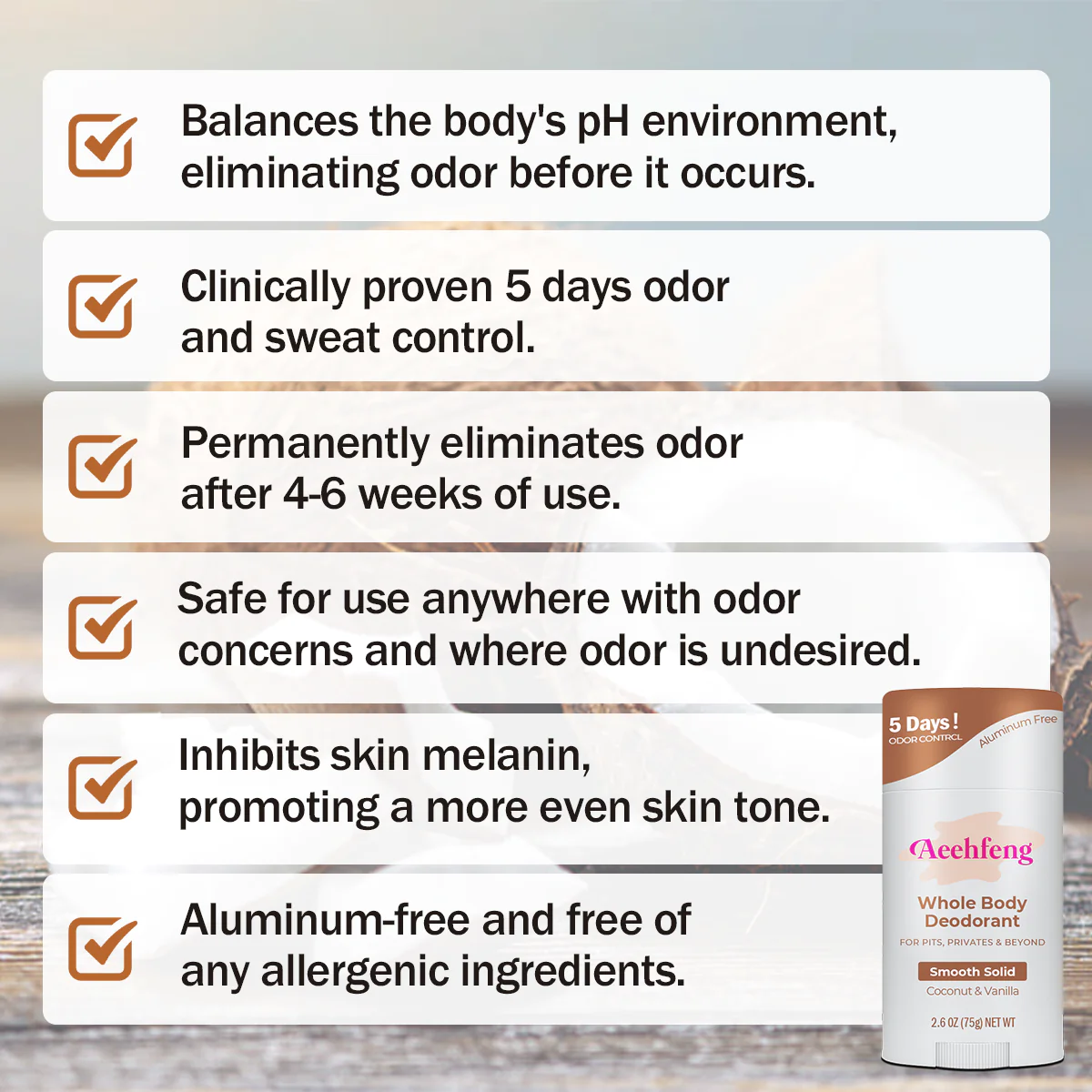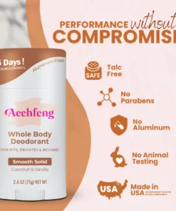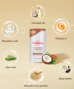 Aeehfeng Whole Body Deodorant never uses: Aluminum or Baking Soda, Benzene, Parabens, Pthalates, SLS, Blue or green dyes and NO animal testing. The innovatively incorporates natural plant ingredients such as amygdalic acid, maranta root powder, coconut oil, aloe vera, shea butter, Vitamin C, probiotics, etc. These components possess antibacterial and anti-inflammatory properties, helping to inhibit the growth of bacteria that cause body odor. Probiotics work to balance body bacteria, reducing the quantity of bacteria caused by sweat. This prevents the onset of odor before it begins. Aeehfeng also incorporates the ultimate moisturizing silky cream designed for breasts, thighs, groin, intimate areas, and skin folds, protecting the skin barrier, effectively preventing rashes and pimples, and resisting heat and humidity.