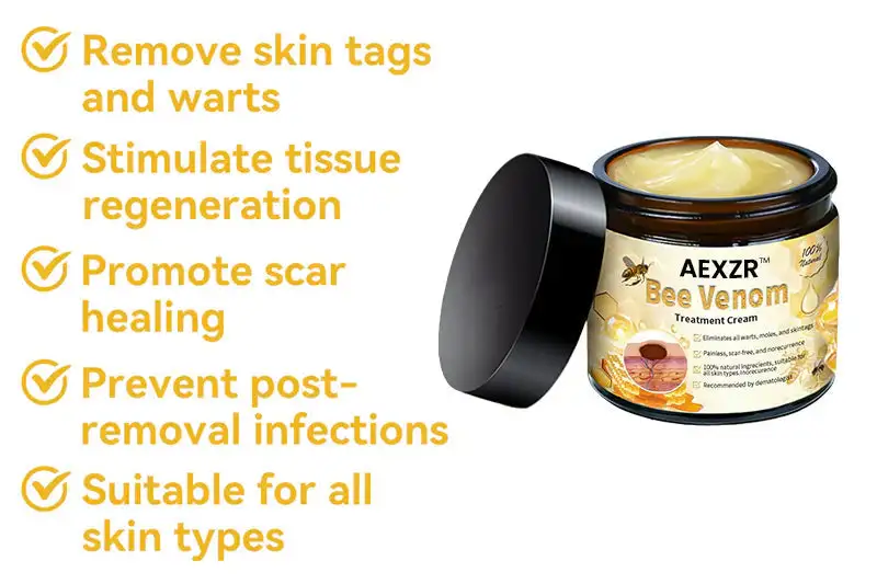 AEXZR™ Bee Venom Treatment Cream offers a solution by leveraging the powerful attributes of bee venom to specifically address diverse skin irregularities like skin tags, moles, warts, and blemishes. Enriched with active components derived from bee venom, this advanced formulation works to dissolve and delicately eliminate undesirable growths.