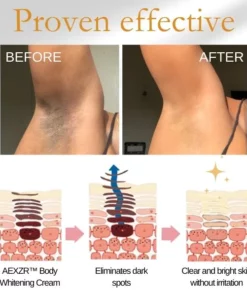 AEXZR™ Body Whitening Cream works by targeting the root causes of darkened skin on the underarms, knees, neck, bikini line, areola, and nipples. It inhibits the production of melanin, the pigment responsible for skin color, which can become overactive and lead to dark spots and uneven skin tone in these areas. By reducing melanin production, AEXZR™ Body Whitening Cream helps to lighten and brighten the skin, resulting in a more even-toned complexion.