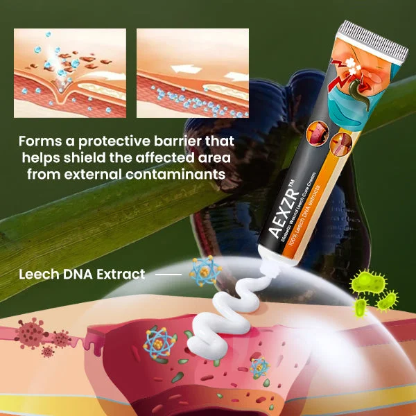 AEXZR™ Diabetic Wound Leech Cure Cream utilizes bioactive compounds from leech DNA to significantly enhance wound healing. Hirudin, a potent anticoagulant, is a primary component that boosts microcirculation by inhibiting thrombin, a crucial enzyme in blood clotting. This improved blood flow ensures efficient delivery of essential nutrients and oxygen to the wound site, speeding up tissue repair. Additionally, the cream contains eglins and other anti-inflammatory peptides that reduce swelling and redness by inhibiting proteolytic enzymes and inflammatory mediators, creating an optimal healing environment.