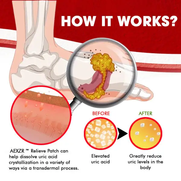Gout, as we know, is caused by uric acid, and treatment for gout entails lowering the amount of uric acid in the joint. The good news is that AEXZR™ Relieve Patch can help dissolve uric acid crystallization in a variety of ways via a transdermal process.