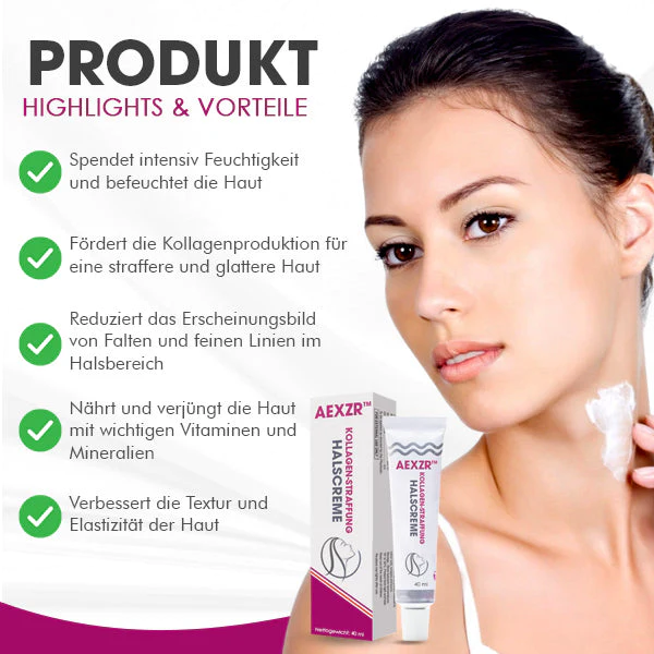 Sie suchen nach einer neuen Lösung, um Ihre Halspartie zu verändern? Dann sind Sie bei der AEXZR™ Kollagen-Straffung Halscreme genau richtig, denn sie mindert feine Linien und Falten und sorgt für ein jugendliches Strahlen!