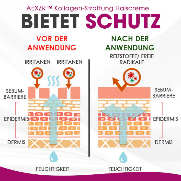 Einer der wichtigsten Inhaltsstoffe unserer Creme ist Kollagen, ein Protein, das natürlicherweise in unserer Haut vorkommt. Kollagen verleiht unserer Haut Struktur und Elastizität, aber mit zunehmendem Alter nimmt die körpereigene Kollagenproduktion ab, was zu Erschlaffung und Falten führt. Durch die Anwendung unserer AEXZR™ Kollagen-Straffung Halscreme können Sie dazu beitragen, den Kollagenspiegel Ihrer Haut wieder aufzufüllen, was ihre Festigkeit und Elastizität verbessern kann.