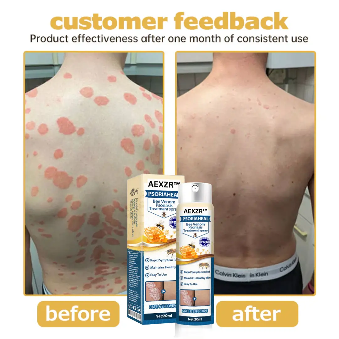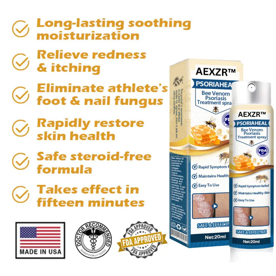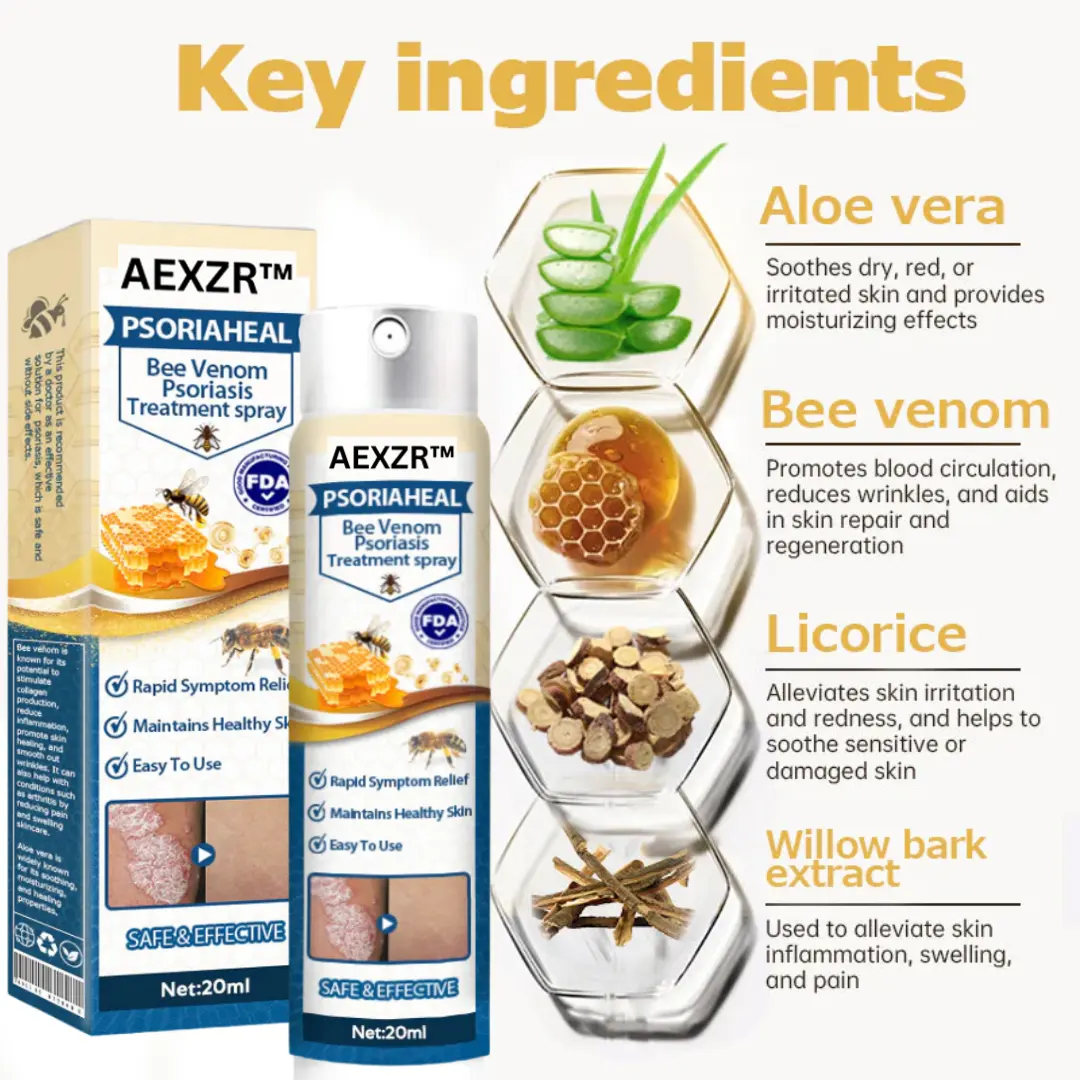 AEXZR™ PsoriaHeal Bee Venom Psoriasis Treatment Spray combines powerful ingredients to effectively combat psoriasis and other skin conditions. Bee venom provides anti-inflammatory and immunomodulatory properties, assisting in the reduction of redness and irritation associated with psoriasis flare-ups. Willow bark is renowned for its antimicrobial properties, which help prevent infections while soothing the skin. Licorice is acclaimed for its skin-soothing benefits, diminishing inflammation and promoting an even skin tone. Lastly, aloe vera is celebrated for its hydrating and calming effects, supplying essential moisture and relief from dryness and discomfort. These ingredients create a comprehensive solution for healthier and more resilient skin.