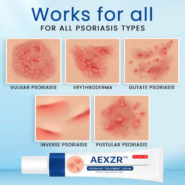 AEXZR™ Psoriasis Treatment Cream is specially formulated to work on all types of psoriasis, including plaque, guttate, inverse, pustular, and erythrodermic. Whether you’re dealing with mild symptoms or severe flare-ups, our advanced cream provides the targeted relief and care your skin needs.