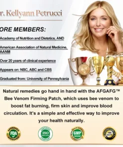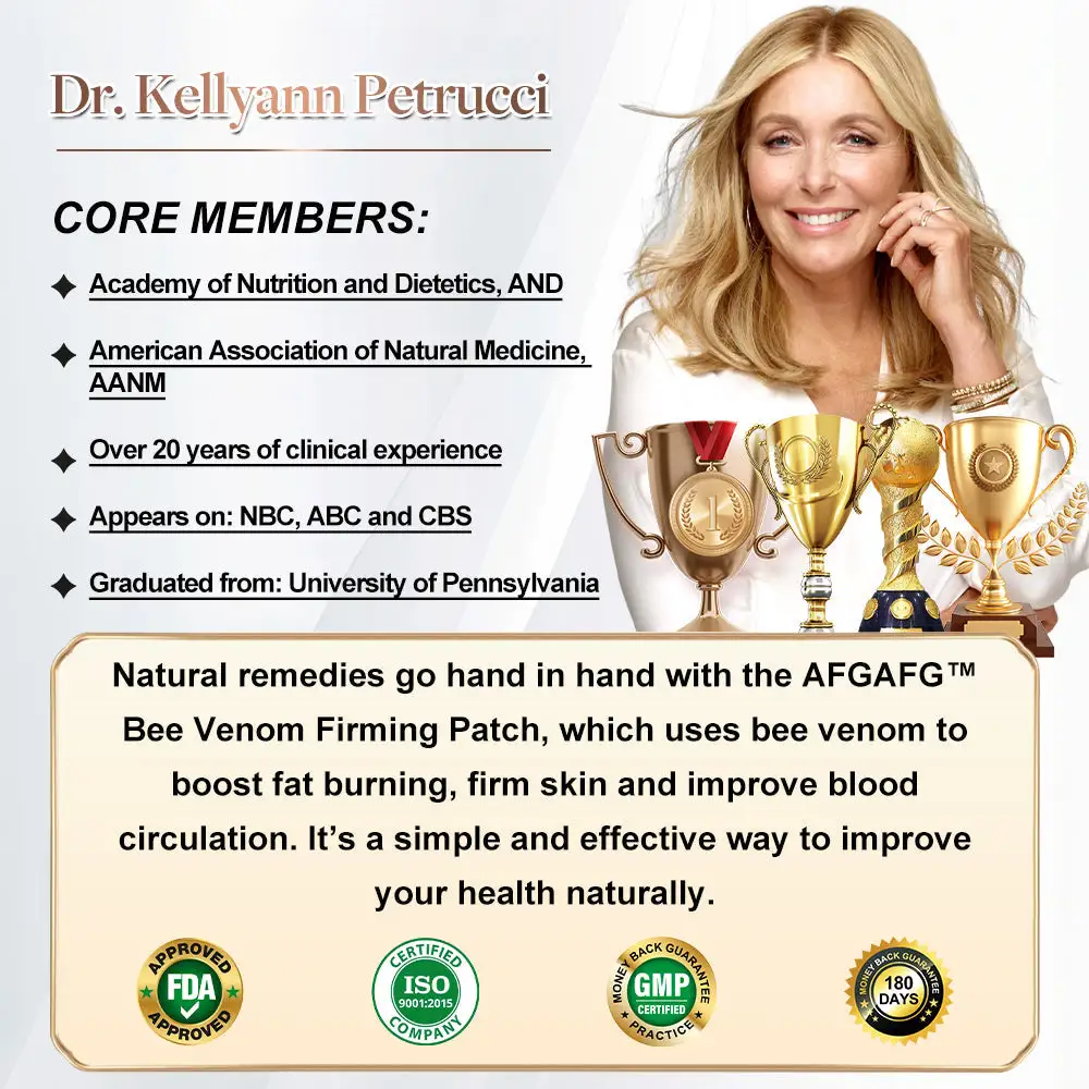 “As an endocrinologist, I have always been passionate about finding natural and effective solutions to help people lose weight. After extensive research and testing with my lab team, combined with clinical trials involving over 2,000 participants, I discovered that bee venom is a powerful natural ingredient that promotes fat breakdown and boosts metabolism. This discovery led me to create the AFGAFG™ Bee Venom Firming Slimming Patch—a comprehensive solution designed to naturally and effectively aid in fat loss and body shaping.”-Dr. Kellyann Petrucci