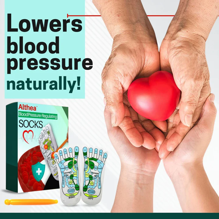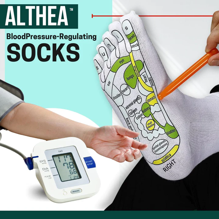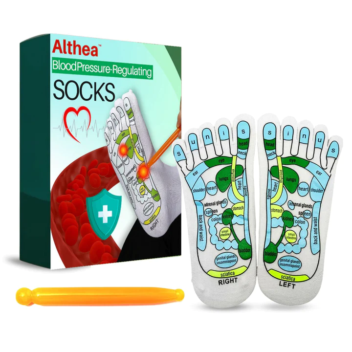 By targeting specific acupressure points on the feet using the printed socks and the stick, Althea™ Blood Pressure-Regulating Socks aim to promote overall health and wellness, all while, providing a comfortable and convenient way to regulate blood pressure and reduce the risk of associated conditions like heart disease and stroke.