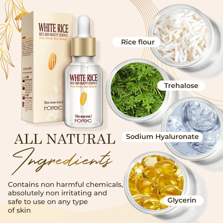 Slow down the signs of aging with Anti-Aging Rice Essence Serum! Made from white rice, hyaluronic acid, and glycerin, these powerful hydrators with anti-aging properties work together to create the most powerful, effective, safest, dermatologically tested, and FDA approved face essence serum in the market!
