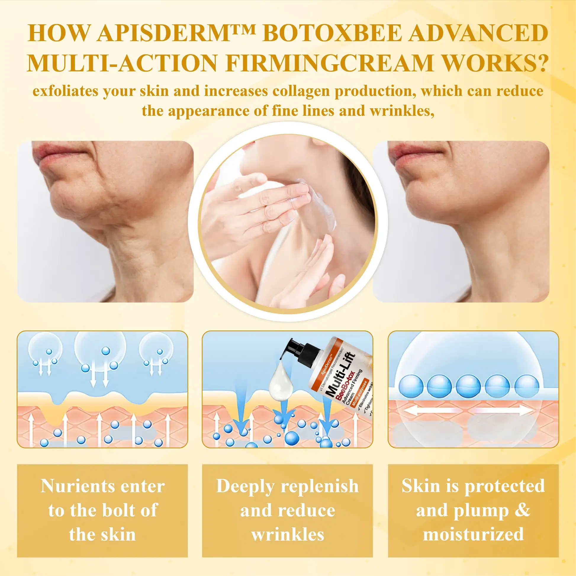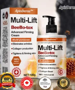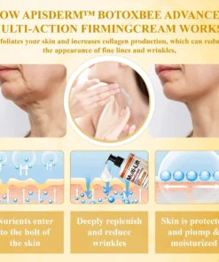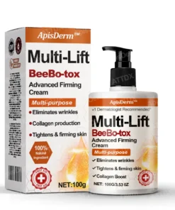 ApisDerm™ Multi-Lift BeeBo-tox Advanced FirmingCream targets wrinkles by using advanced technology to penetrate the skin relaxing facial muscles and reducing fine lines such as those on the forehead, crow’s feet, and lips. It stimulates collagen production improving skin elasticity and firmness which enhances the appearance of the face, neck, arms, abdomen, and thighs. The cream effectively tightens loose skin, redefines contours, and smooths sagging areas. With consistent use, it promotes a firmer, more youthful, and sculpted appearance across the body.