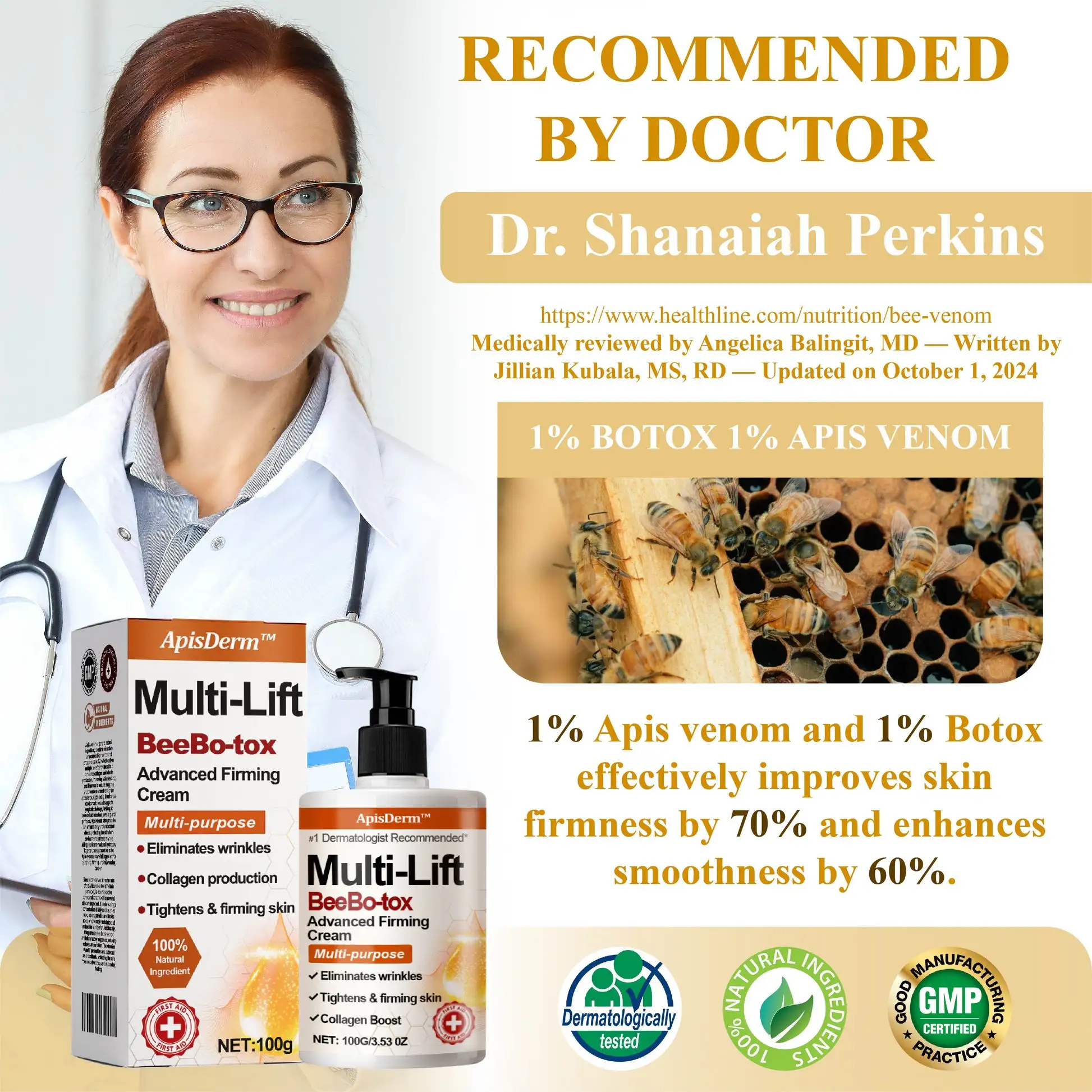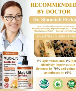 According to Dr. Shanaiah Perkins, a renowned dermatologist at the Dermacare Institute as of August 16, 2024, the ApisDerm™ Multi-Lift BeeBo-tox Advanced FirmingCream containing 1% Apis venom and 1% Botox effectively combines the skin-tightening and smoothing effects of Apis venom which stimulates collagen production to enhance skin elasticity and firmness with Botox’s ability to temporarily relax targeted muscles reducing wrinkles and providing a more youthful appearance.