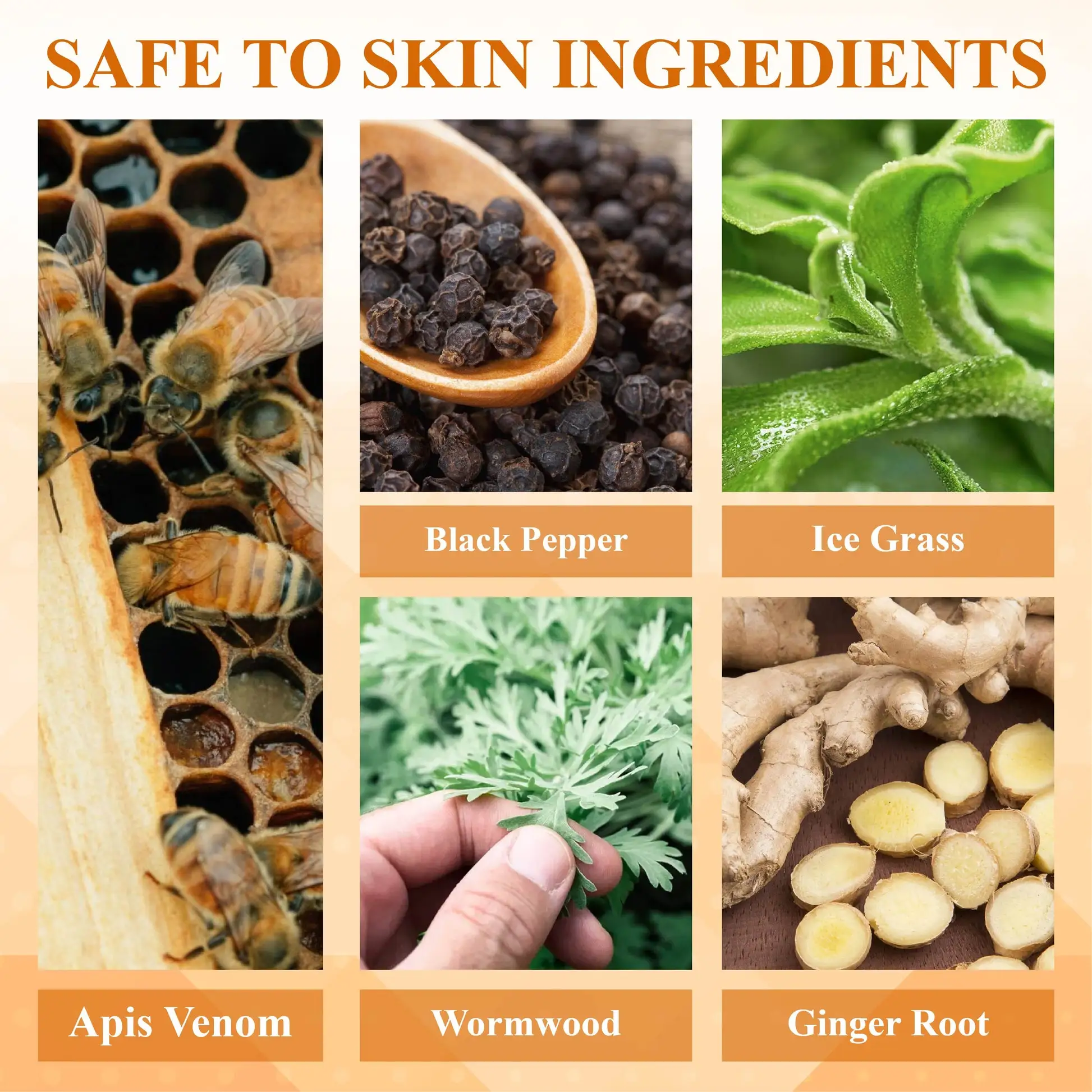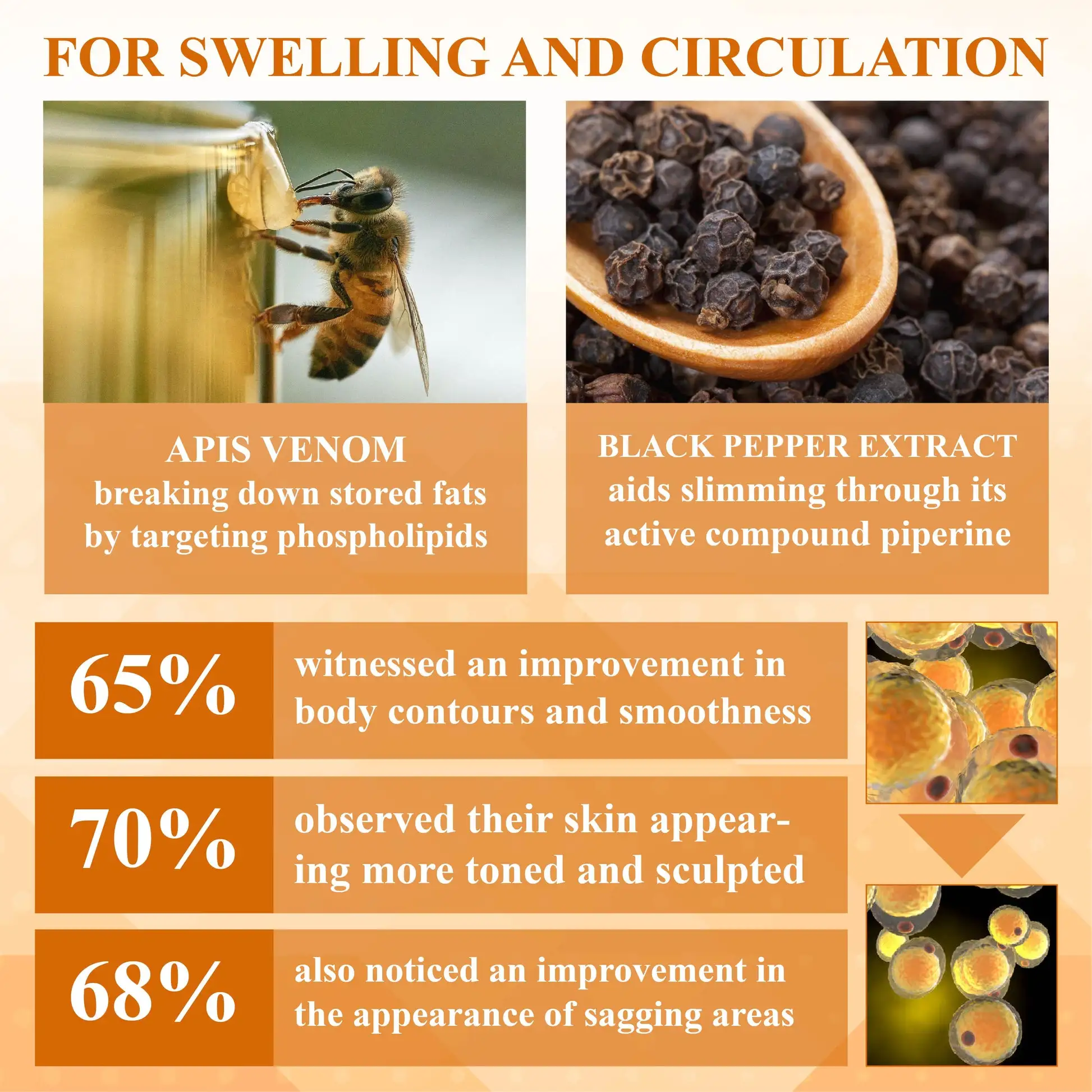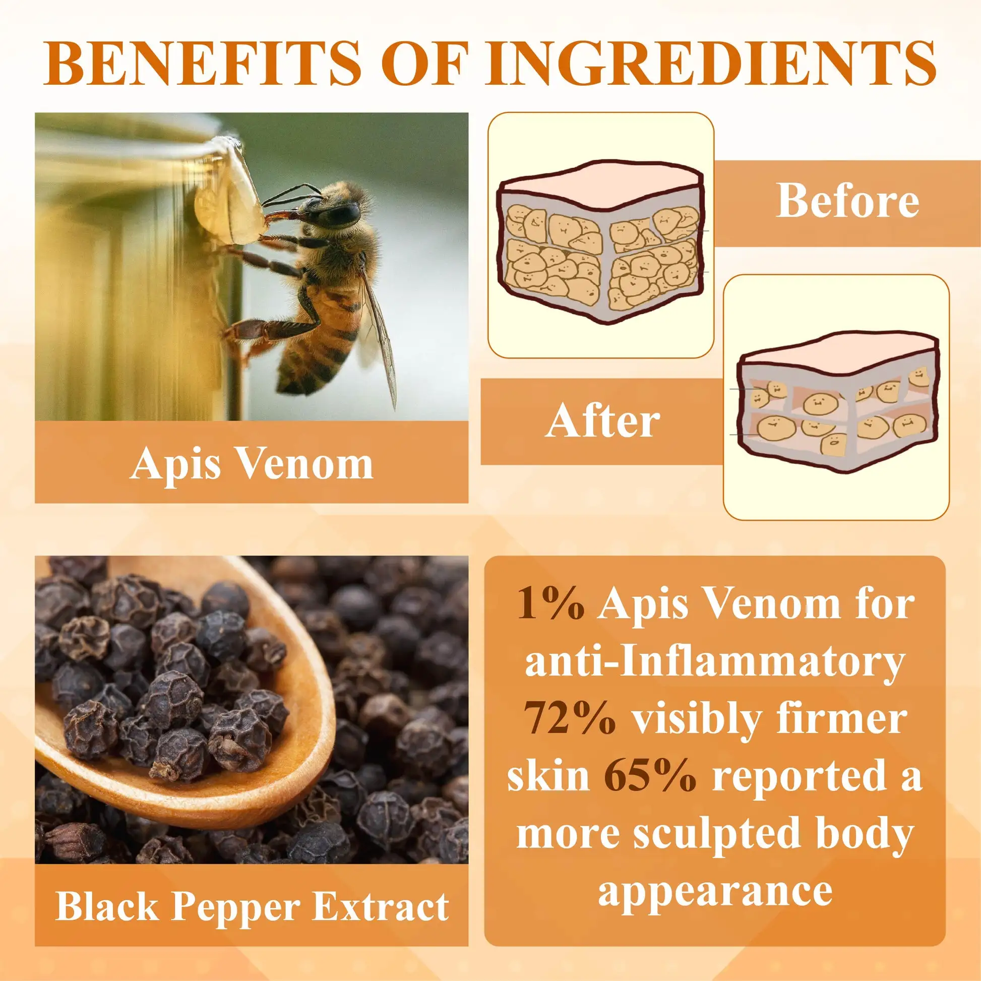 ApisSculpt™ VenomDetox BodyContour FirmingOil combines powerful ingredients to support slimming and firming. Apis venom stimulates circulation and detoxification, helping to break down stored lipids and reduce swelling. Black Pepper Extract enhances metabolism and boosts fat-burning while improving the absorption of other active ingredients. Icegrass Extract hydrates and soothes the skin, Wormwood Extract targets toxins to reduce water retention, and Ginger Root Extract promotes healthy circulation, further supporting the body’s natural contouring process.
