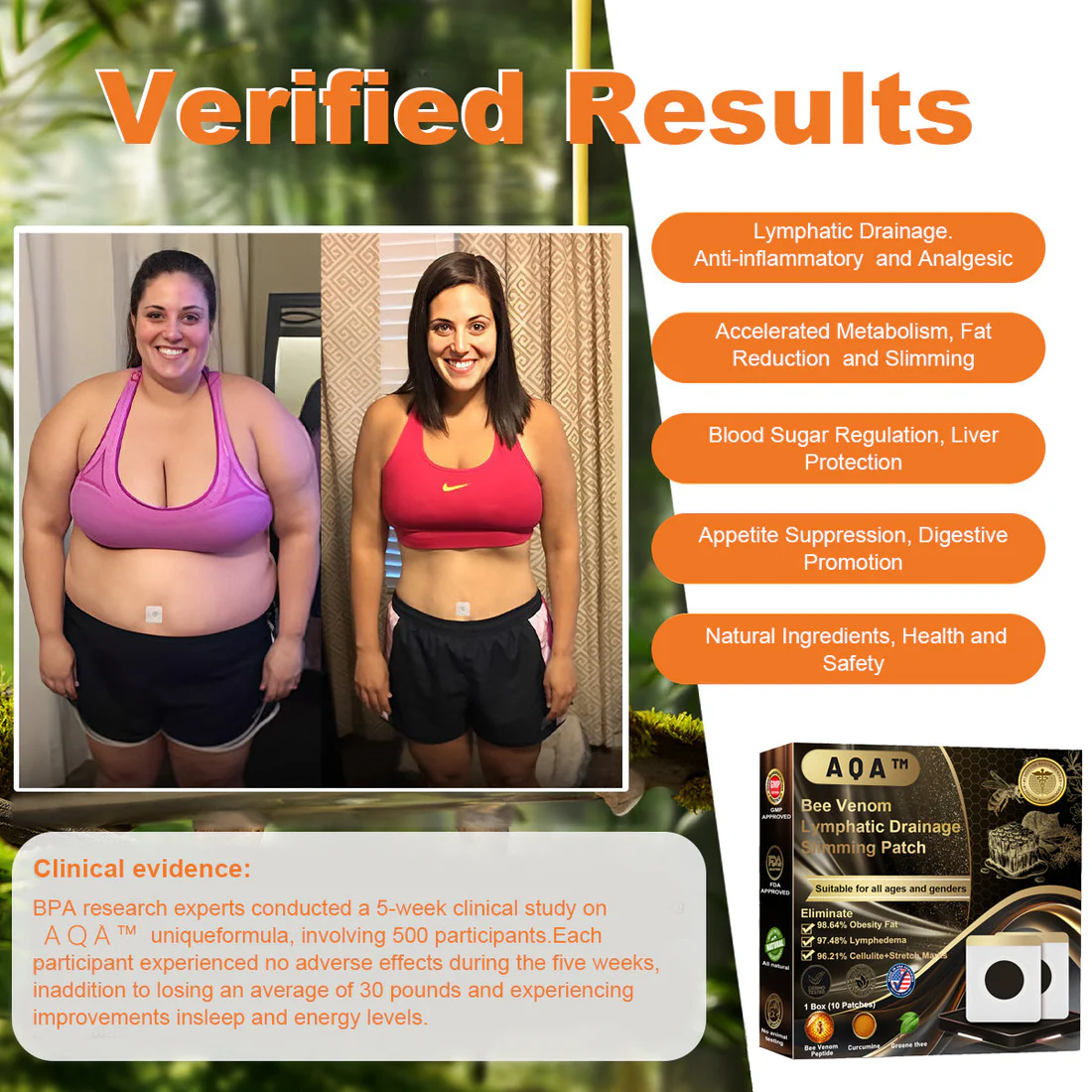 I have combined various botanical ingredients, long known for their benefits to the lymphatic system and body metabolism, to create AQA™ Bee Venom Lymphatic Drainage Slimming Patch. Experimental evidence indicates that this lymphatic drainage slimming patch is the optimal choice for improving the lymphatic system. The blend of these natural botanical ingredients, coupled with the potent properties of bee venom, offers a groundbreaking solution for swiftly addressing metabolic disorders and lymphatic congestion issues.