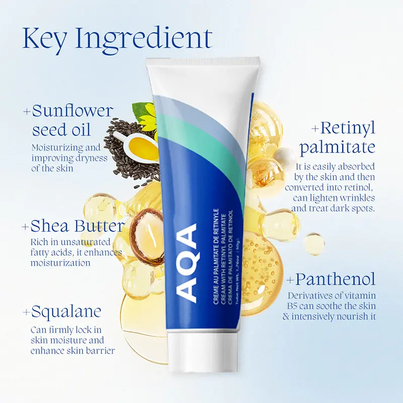 AQA combines powerful ingredients to combat skin aging. Retinyl palmitate (a milder form of retinol) boosts cell turnover, reduces fine lines, wrinkles, and hyperpigmentation, while stimulating collagen production for firmer skin. Sunflower oil and shea butter provide deep hydration, nourish, and soothe the skin, improving texture and elasticity. Squalane locks in moisture, protects the skin barrier, and enhances hydration without clogging pores. Panthenol (Pro-Vitamin B5) helps heal, soothe, and retain moisture, preventing dryness and irritation. Together, these ingredients work to hydrate, smooth, and rejuvenate the skin, providing anti-aging benefits while maintaining skin comfort.