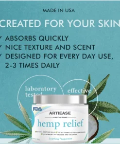 MADE AND TESTED IN THE USA FORMULATION – Our ARTIEASE™ Hemp Pain Relief Gel is made in the USA, lab tested by an independent third party lab, and FDA approved. We have the Climate Friendly Commitment badge and guarantee no genetically modified cosmetics and animal testing, proving the positive effects of ARTIEASE™ Hemp Pain Relief Gel on bone disorders. Studies have shown that after 2 weeks of using the gel, patients experienced a significant reduction in pain, stiffness and inflammation, as well as an improvement in overall joint and bone health.