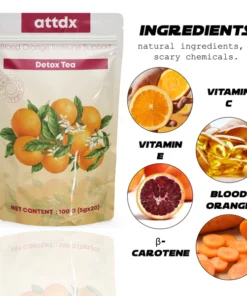 ATTDX BloodOrange ImmuneSupport DetoxTea contains natural ingredients that help your body burn fat, increase energy and make you more active. It helps break down fats through a process that triggers the breakdown of stored fats to be used as energy, potentially leading to slimming.