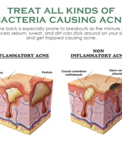 Back acne is acne that develops on your back. It happens when sweat, oil, dead skin cells, and bacteria get trapped in your skin’s pores. Backpacks, sweaty shirts, or sports equipment can create friction on your back and worsen back acne. Acne can occur on any part of the body, but it is most common on the back because the mixture of excess sebum, sweat, and dirt can stick around on your skin and get trapped under layers of clothing. This creates a breeding ground for acne-causing bacteria.