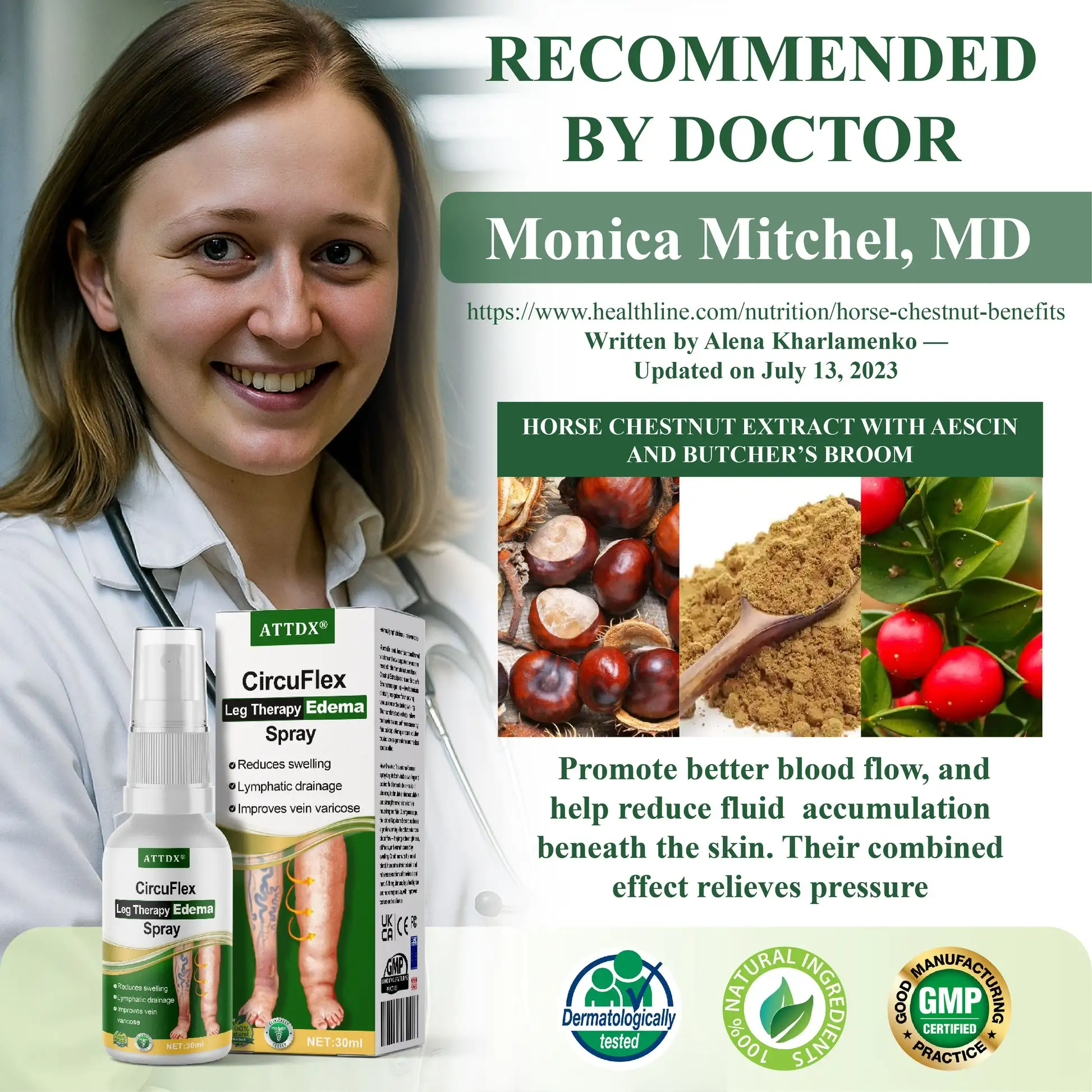 Probably the most visible ATTDX edema product, with thousands of site-hosted reviews claiming 50–75% swelling reduction in 1–2 weeks. Ingredients include Horse Chestnut extract (aescin), Ruscus aculeatus (butcher’s broom), Centella asiatica, and Ginkgo biloba for vascular support, tissue drainage, and antioxidant action ATTDX+2Charmflowing+2ATTDX+2.