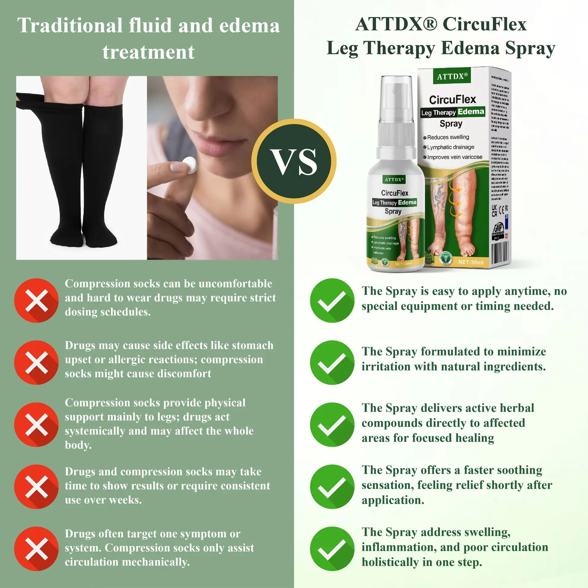 Assuming CircuFlex spray is intended for similar uses (edema, leg fluid retention, varicose support), here’s how these products compare: