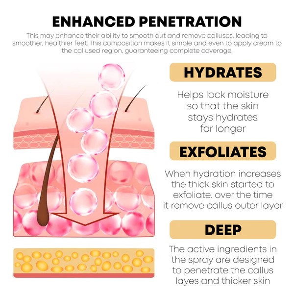 ATTDX FootCalluses CornRemoval Treatment Spray is specially formulated to help remove those calluses and dead skin from your feet. The active compounds in our product penetrate the callus layers when sprayed onto the affected areas, releasing the connections holding dead skin cells together. This activity results in a softer texture by making it simpler to remove the callus’s outer layers. It softens the skin, exfoliates tough calluses, and boosts moisture content for soothing comfort and relief from pain.