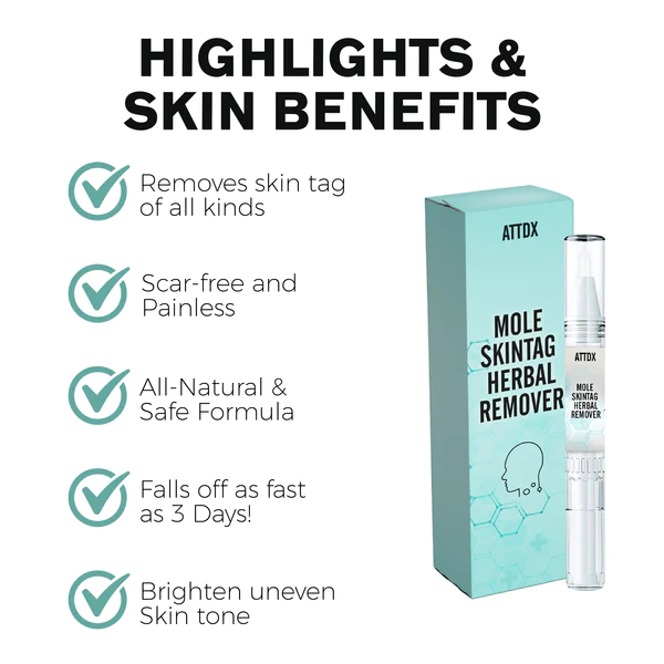 ATTDX Mole SkinTag Herbal Remover is a fast-acting, all-natural skin tag remover. Its active ingredients destroy the warty tissue, causing it to break off and fall off. Apply this herbal remover on the face or body to dry and diminish the tags until they fall off the surface of the skin naturally.
