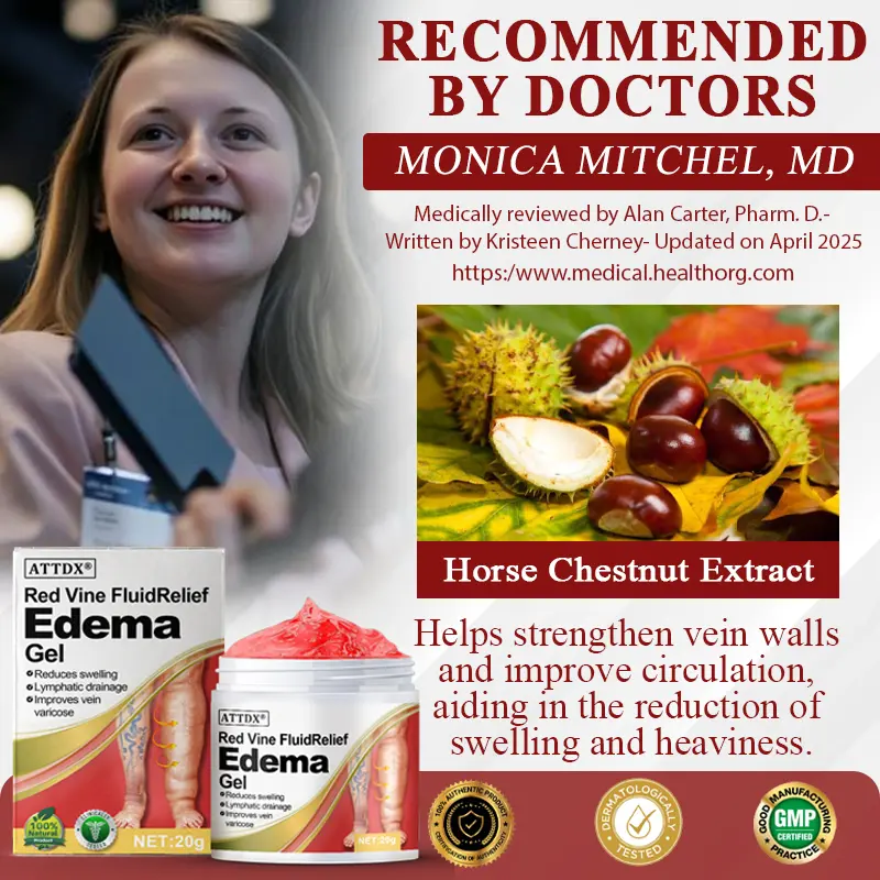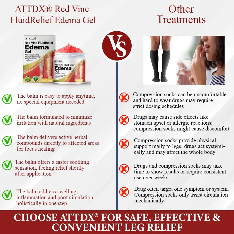 The Red Vine FluidRelief Edema Gel from ATTDX® is marketed as a fast‑absorbing herbal gel targeting swelling and fluid retention across legs, arms, hands, ankles, and areas affected by edema, varicose veins, or poor circulation. It contains Horse Chestnut, Red Vine Leaf extract, Butcher’s broom, Frankincense, and Angelica sinensis, with claims of visible relief in as little as 7 days, non-greasy texture, and suitability for sensitive skin
