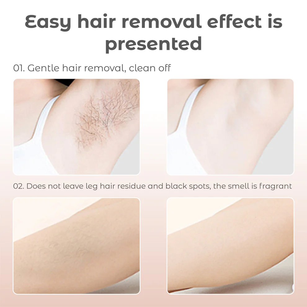 Gentle and hypoallergenic, enriched with plant extracts for a soothing and non-irritating experience. Infused with imported soothing ingredients, free from any irritants, ideal for sensitive skin. Effortlessly remove hair with our easy-to-use cleaning technology, leaving no dark spots or residue, and boasting a pleasant, fresh scent.