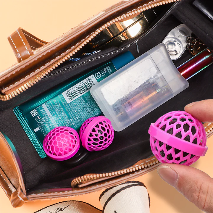 The size of the Bag Cleaning Ball is smaller than a golf ball. So it’s small enough to fit in any bag without adding too much bulk. It’s a perfect pocket cleaner for toiletry and makeup bags, purses, backpacks, and sports bags!