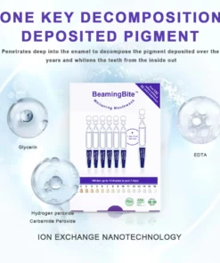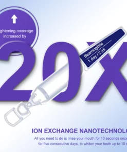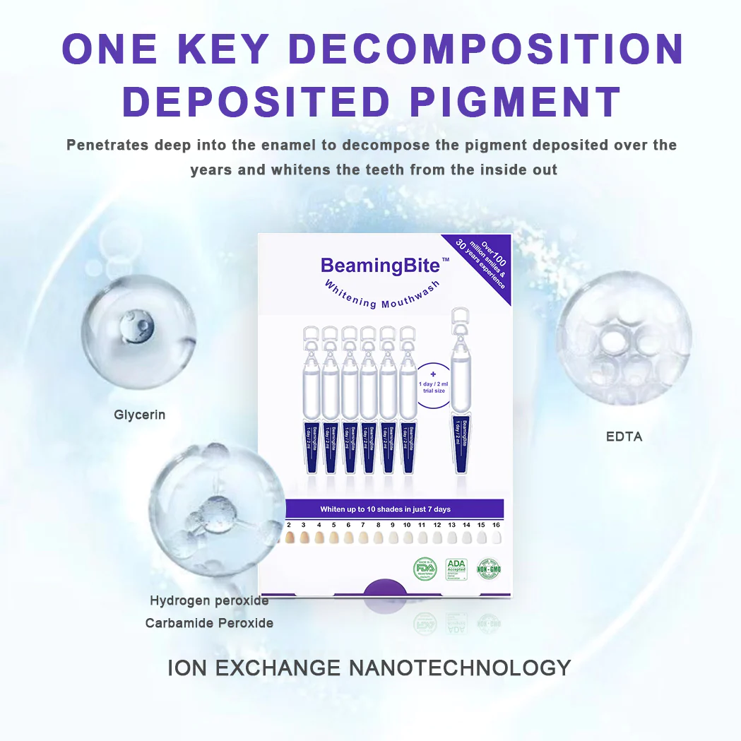 The working principle of BeamingBite™ Whitening Mouthwash for teeth whitening:Unlike traditional teeth whitening ion exchange technology, ION EXCHANGE NANOTECHNOLOGY has a larger surface area, which improves the adsorption and antibacterial properties of the component ions. Its ability to adsorb and remove stains and discoloration from teeth is 20 times greater than traditional methods. Additionally, it has stronger penetration power, and its antibacterial components can comprehensively eliminate bacteria and protect teeth. Clinical data shows that this technology improves the effectiveness of treating oral diseases by more than 10 times.