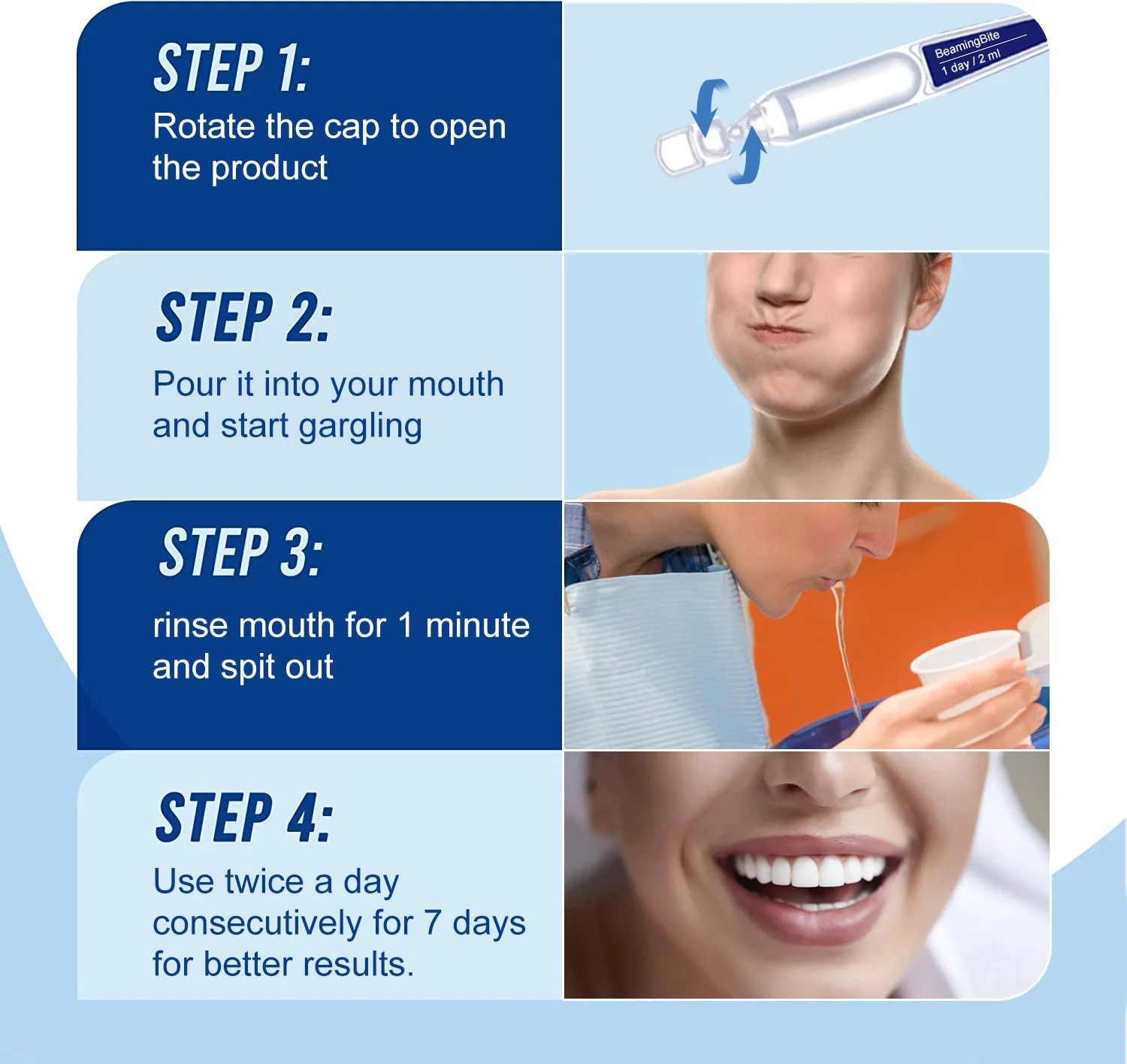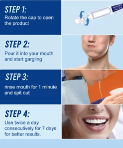 BeamingBite™ Whitening Mouthwash helps you kill 98.99% of bacteria, instantly eliminates bad breath, removes plaque in 1 week, whitens teeth comprehensively in 3 weeks, and thoroughly solves various oral problems (including cavities, tartar, toothache, tooth discoloration, tooth sensitivity, gum bleeding and pain, mouth ulcers, gingivitis and periodontitis, as well as enamel erosion).