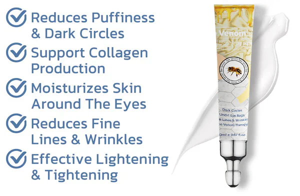 Firming and Tightening: Ingredients in bee venom also help tighten the skin, combating the sagging of skin around the eyes that occurs with aging.