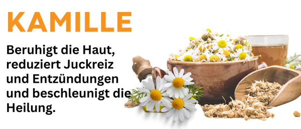 KAMILLE: Kamille ist wegen ihrer beruhigenden und entzündungshemmenden Eigenschaften ein beliebter Inhaltsstoff in Hautpflegeprodukten. Es beruhigt die Haut, reduziert Juckreiz, Stechen und Entzündungen und bietet Komfort. Darüber hinaus unterstützt Kamille die Wundheilung, hilft bei der Gewebereparatur und beschleunigt die Regeneration der Haut.