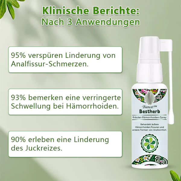 Wir stellen vor: Biancat™ Bestherb Kräuter-Hämorrhoiden-Spray, eine revolutionäre Lösung, die entwickelt wurde, um Ihnen beruhigende Linderung und verbesserten Komfort bei den Beschwerden von Hämorrhoiden zu bieten. Unser sorgfältig formuliertes Spray kombiniert die alte Weisheit von Kräuterheilmitteln mit der modernen Wissenschaft, um einen natürlichen, effektiven Ansatz zur Hämorrhoidenpflege zu bieten.