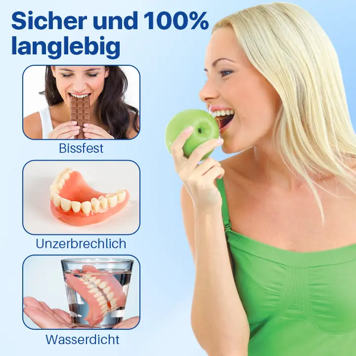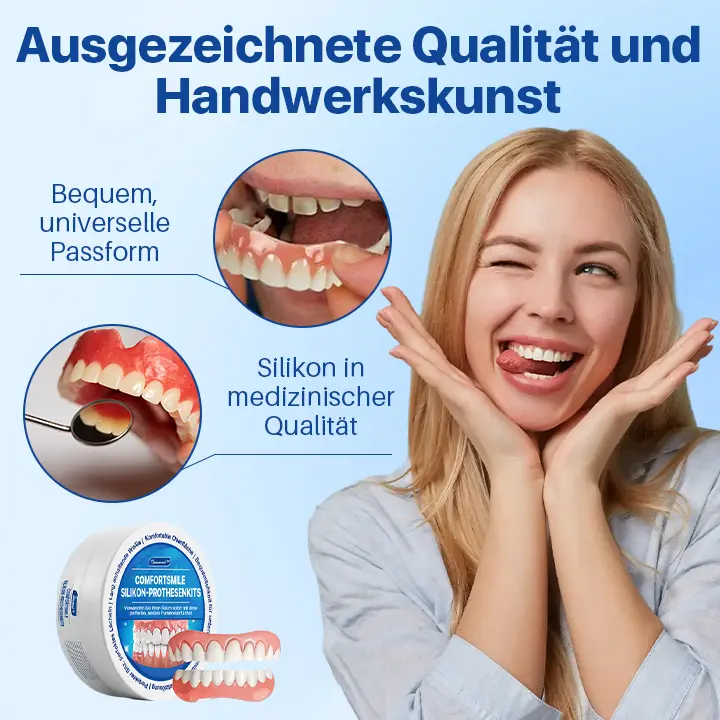 Sofortiges perfektes Lächeln: Erreichen Sie umgehend ein makelloses, strahlendes Lächeln mit dem Biancat™ ComfortSmile Silikon-Prothesenkits. Dieses innovative Kit gewährleistet von Beginn an eine maßgeschneiderte Passform, die sich natürlich und komfortabel anfühlt. Kein Unbehagen oder Reizungen mehr – genießen Sie einen nahtlosen Übergang zu besser sitzenden, bequemen Prothesen, die Ihr Selbstvertrauen mit jedem Lächeln steigern. Die einfache Anpassung ermöglicht eine schnelle Anwendung, sodass Sie sofort von den Vorteilen profitieren können.