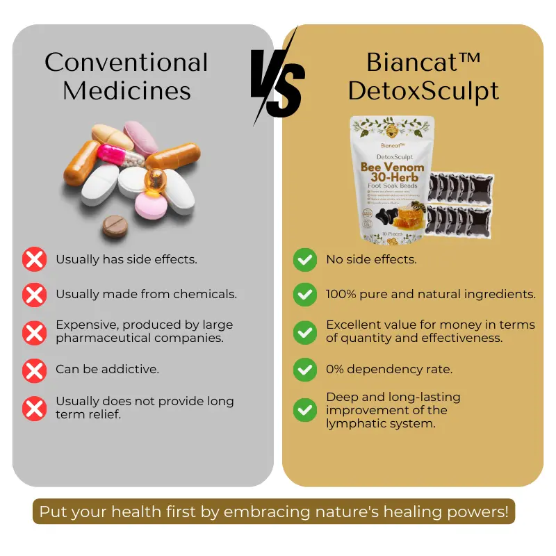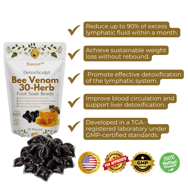 Biancat™ DetoxSculpt Bee Venom & 30-Herb Foot Soak Beads are lymphologist-tested, hypoallergenic, and safe for all ages. This 100% natural product serves as a holistic alternative to prescription medications, over-the-counter solutions, and weight loss or lymphatic drainage treatments. With regular use, it helps improve the function of the lymphatic system, naturally supports detoxification, and strengthens the immune system, offering a gentle yet powerful way to boost overall health.
