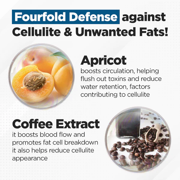 Apricot: Rich in vitamins A and E and antioxidants, can aid in cellulite reduction. Its oil, when massaged into the skin, boosts circulation, helping flush out toxins and reduce water retention, factors contributing to cellulite.