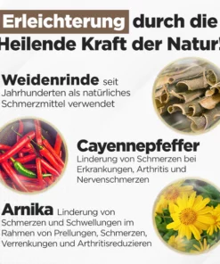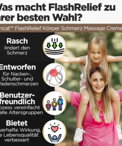 Die FlashRelief-Creme von Biancat™ fördert die Durchblutung und reduziert Entzündungen in der betroffenen Region. Sie dringt tief in die Haut ein, erreicht die Muskeln und Gelenke und blockiert die Schmerzsignale zum Gehirn. Das Ergebnis? Schnelle, effektive Linderung genau an der Stelle, wo Sie es benötigen.