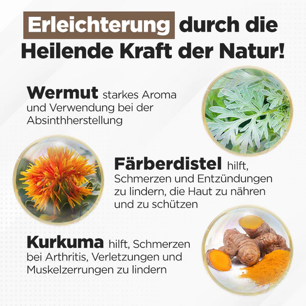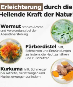 - Inhaltsstoffe: Wermut, Färberdistel, Kurkuma, Weidenrinde, Cayennepfeffer, Arnika.