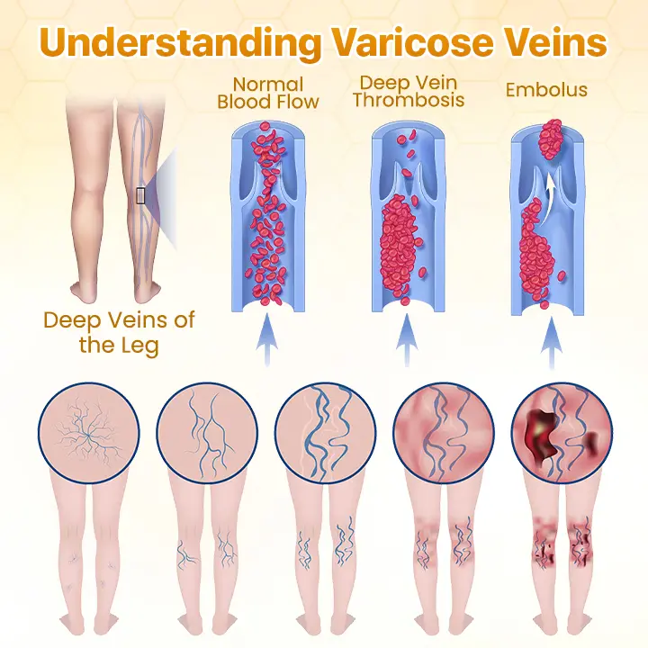 They arise mainly from valve damage, increasing venous pressure. Early symptoms are often absent, but some may feel itching, swelling, leg pain, or heaviness after prolonged standing. As it worsens, pain can increase, blood clots may form, and ankles might turn purple. Severe cases can result in pigmentation, eczema-like dermatitis, ulcers, and bleeding. Thrombophlebitis, marked by redness, swelling, pain, and nodules, may also occur. A clot reaching the lungs can cause a pulmonary embolism.
