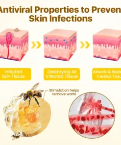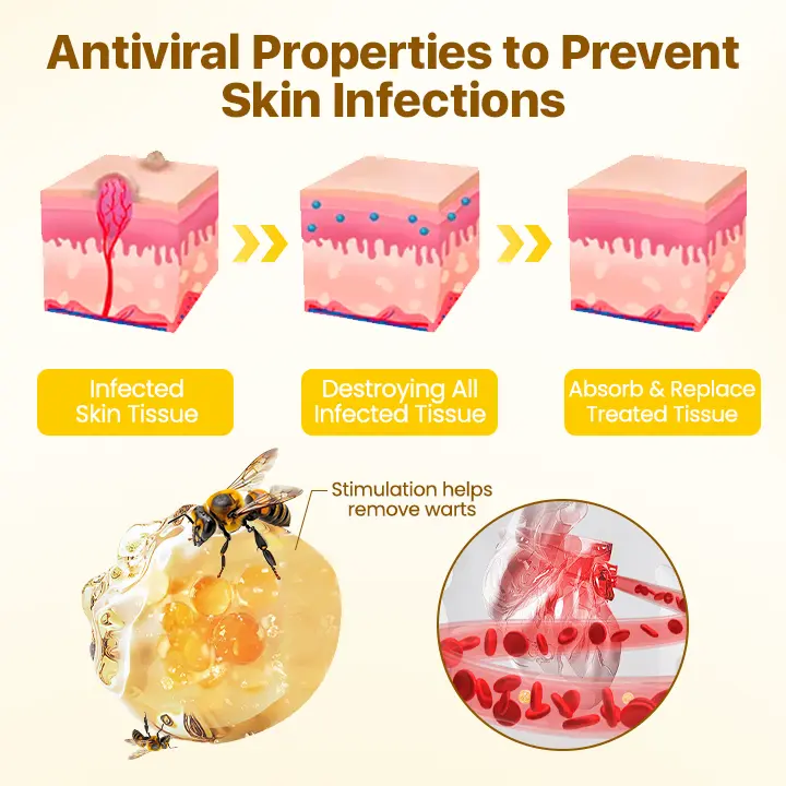 Scientific studies show that bee venom has powerful antiviral effects, inhibiting the replication of viruses that can cause skin infections. During the process of treating acne, eczema, or warts, bee venom induces apoptosis (programmed cell death) in abnormal cells, effectively clearing problematic skin areas while protecting healthy tissue.