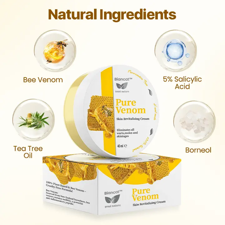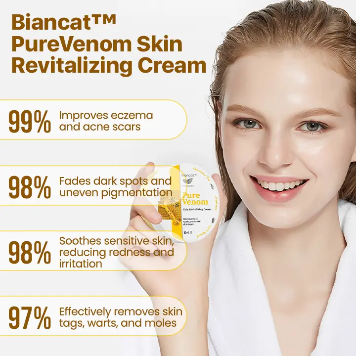 Are you frustrated by the constant battle with eczema, acne, pigmentation, warts, or varicose veins? It’s time to put an end to your skin worries! Introducing Biancat™ PureVenom Skin Revitalizing Cream—the ultimate remedy for flawless, rejuvenated skin. Packed with nature’s potent healer, bee venom, this powerful formula works wonders to soothe, repair, and regenerate your skin, bringing it back to its healthiest state. Feel the transformation with every application!