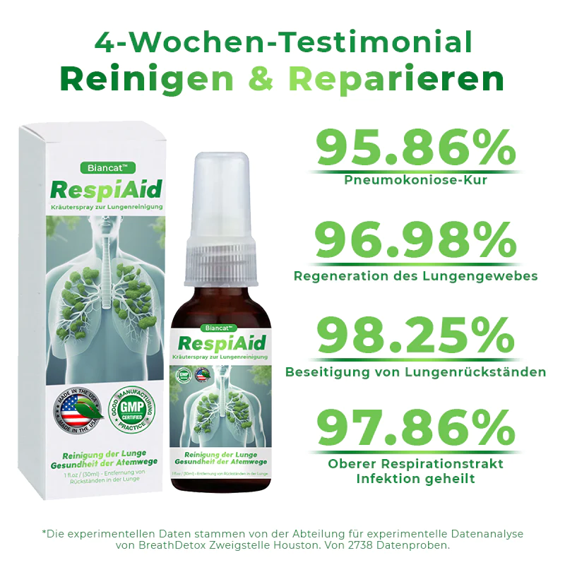Eine umfassende 28-tägige klinische Studie mit 2.738 Teilnehmern weltweit hat die Wirksamkeit von Biancat™ RespiAid bei der Reinigung und Verjüngung der Lungen von Rauchern oder Personen, die Staub ausgesetzt waren, bewiesen. Nutzer berichteten von einer signifikanten Linderung von Husten, Atemnot, Schleimproduktion, Brustschmerzen und Atembeschwerden.