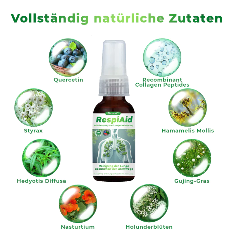 Der angesehene Dr. Harper und sein renommiertes Forschungsteam haben Biancat™ RespiAid meisterhaft entwickelt, ein bahnbrechendes Kräuter-Lungenspray zur Reinigung, das der Gesundheit von Lungen und Atemwegen gewidmet ist. Mit Präzision entwickelt, nutzt dieses innovative Spray die Kraft sorgfältig ausgewählter natürlicher Pflanzenextrakte, um erhebliche Erleichterung von stressinduzierten Allergien zu bieten. Bei der Anwendung wirkt das Spray schnell, bietet sofortigen Komfort und verbessert die Lungenfunktion signifikant, indem es Schleim und Toxine effektiv klärt und so eine optimale Atemfunktion gewährleistet.